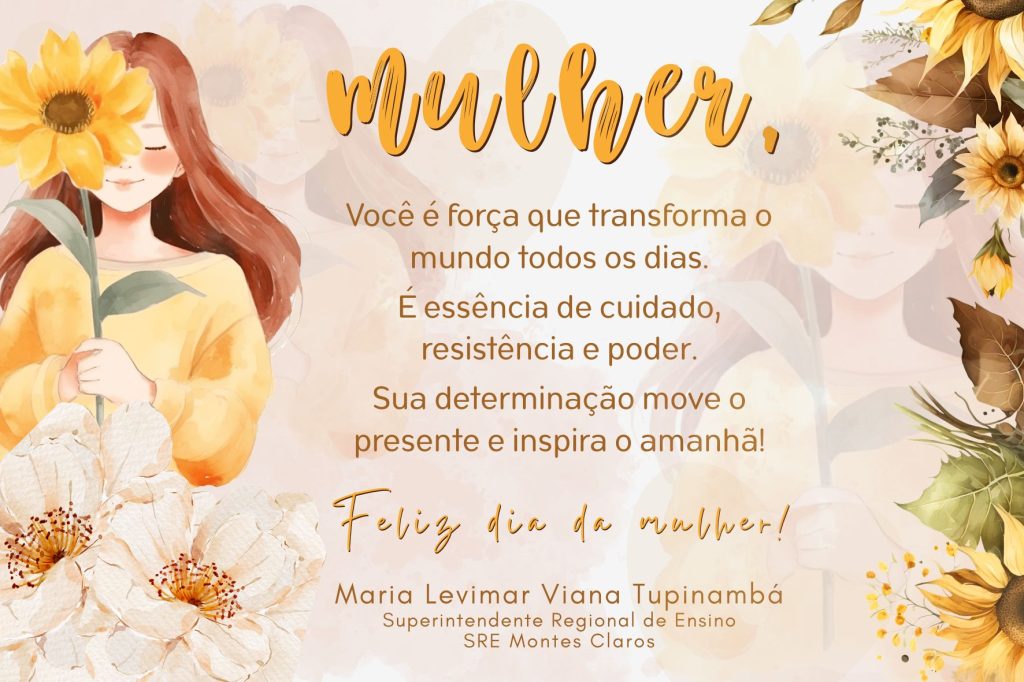 A Superintendência Regional de Educação, na pessoa de nossa Superintendente Maria Levimar Viana Tupinambá e em nome de todos que integram essa SRE de Montes Claros, parabeniza todas as servidoras e colaboradoras pelo Dia Internacional da Mulher… Parabéns!!!