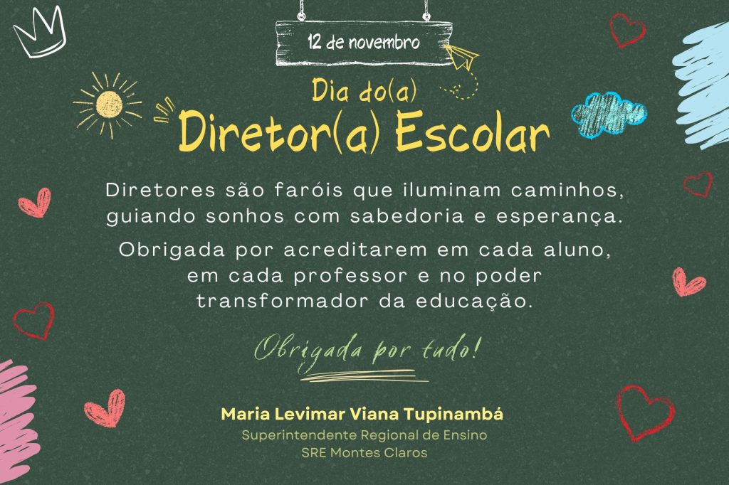 A Superintendência Regional de Educação, na pessoa de nossa Superintendente Maria Levimar Viana Tupinambá e em nome de todos que integram essa SRE de Montes Claros, deseja a todos(as) os(as) diretores(as) um FELIZ DIA DO(A) DIRETOR(A) ESCOLAR.
